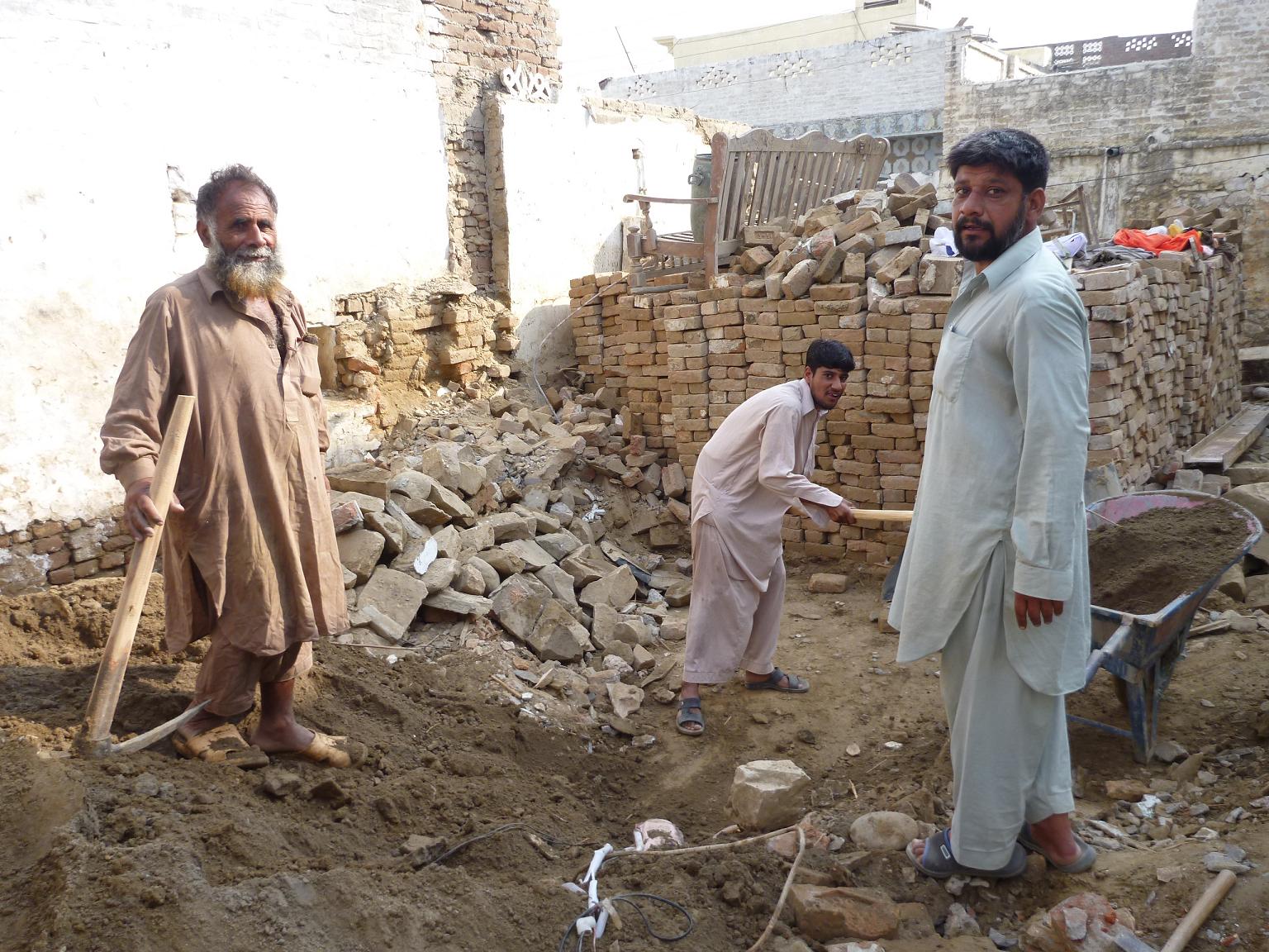 ein trauriges Bild: Ein Pakistani versucht das Mauerwerk mit einem Stein "niederzureissen". Ein Hammer waere hier nicht schlecht!