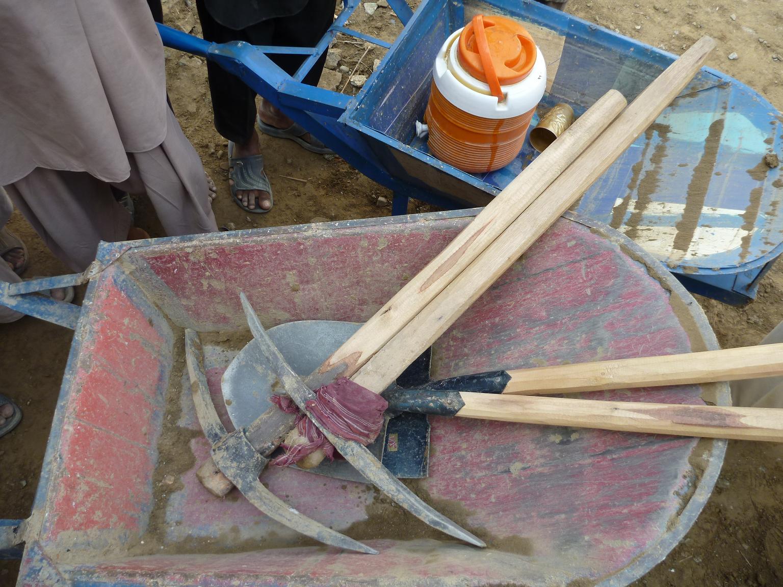 Sack Zement = ca.4 Euro, Ziegelstein = ca.5 Cent, Stahl 1kg = ca.60 Cent, Holz (square foot) = 12 Euro, Sand (LKW-Ladung) = 13 Euro, Kies (LKW-Ladung) = 35 Euro, Schubkarre = ca.25 Euro,Hammer = ca.2 Euro, Spitzhacke = ca.4 Euro, Schaufel = ca.2 Euro, Wanne = ca.50 Cent